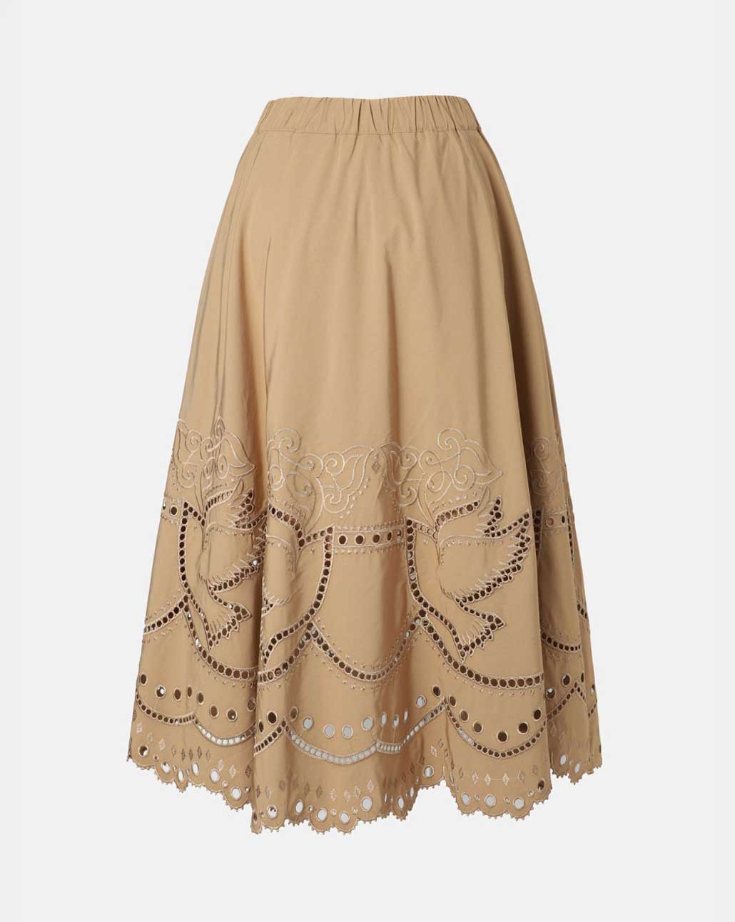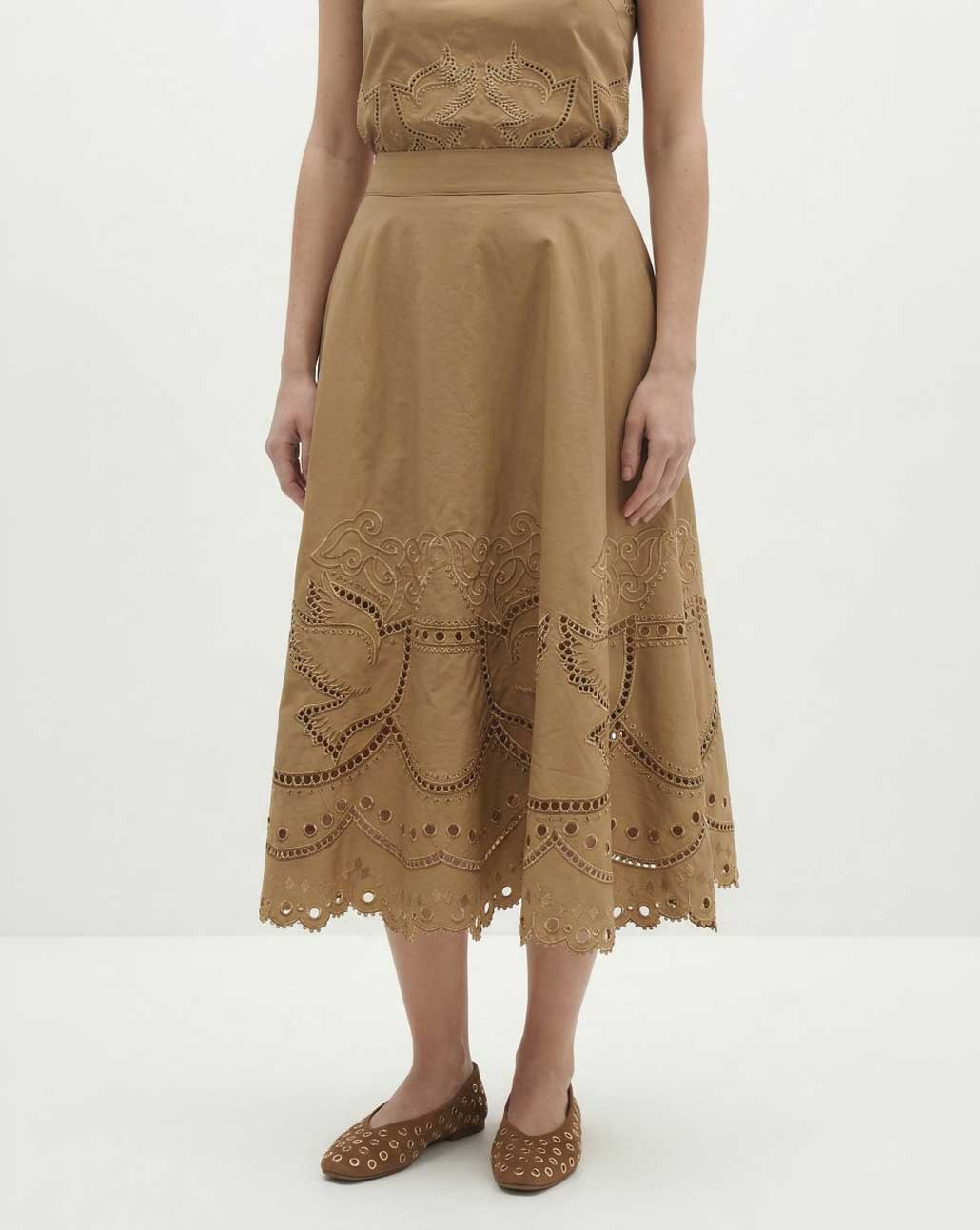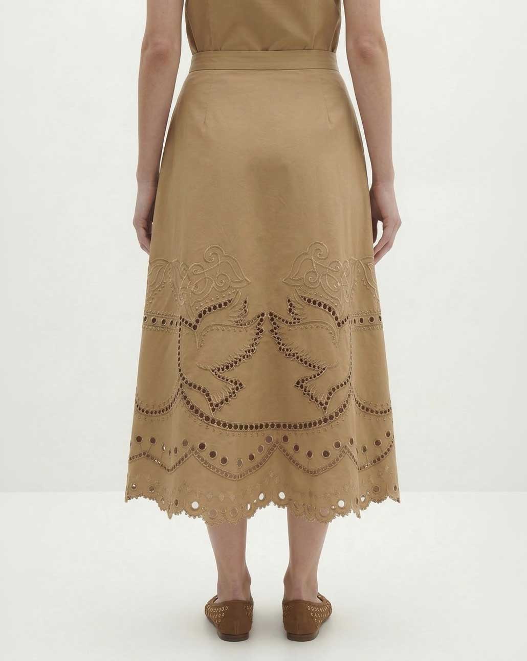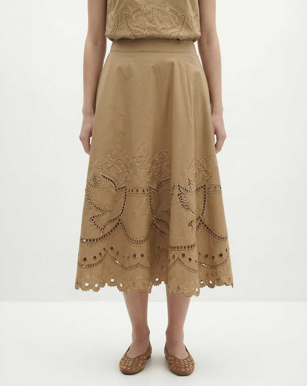 Esta falda midi combina comodidad y elegancia gracias a su cintura elástica y acabado en bordado inglés en el bajo, aportando un toque femenino y refinado. Combínala con un top fluido o blusa ligera para un look veraniego chic y moderno.