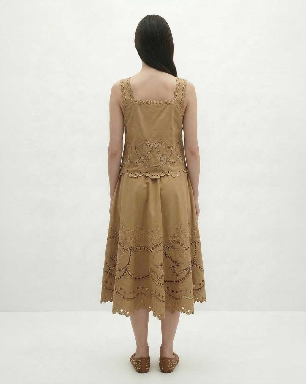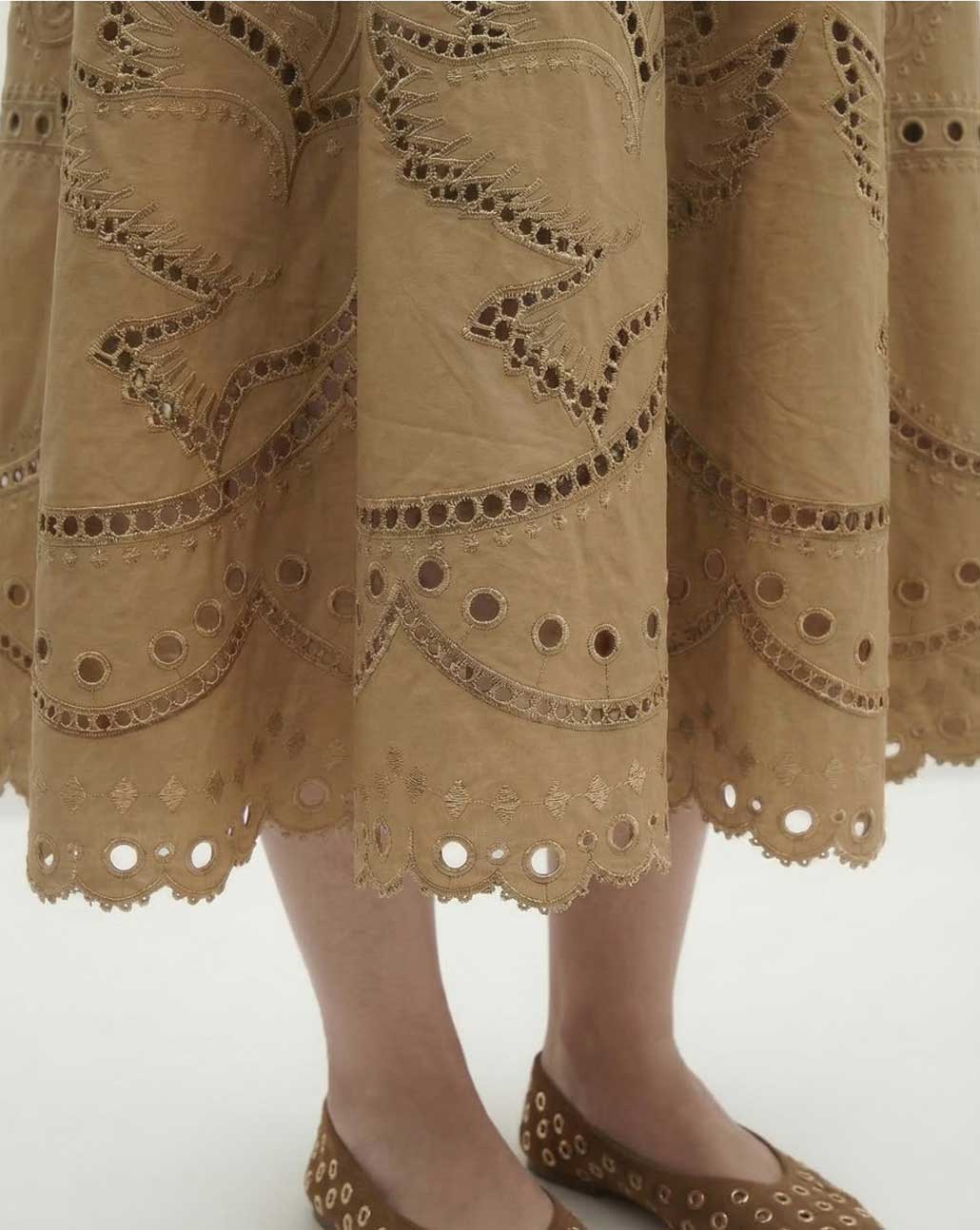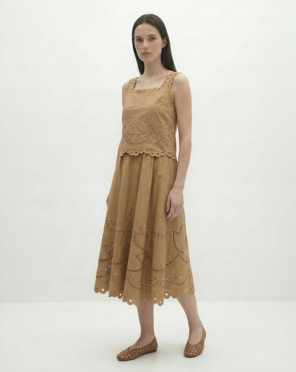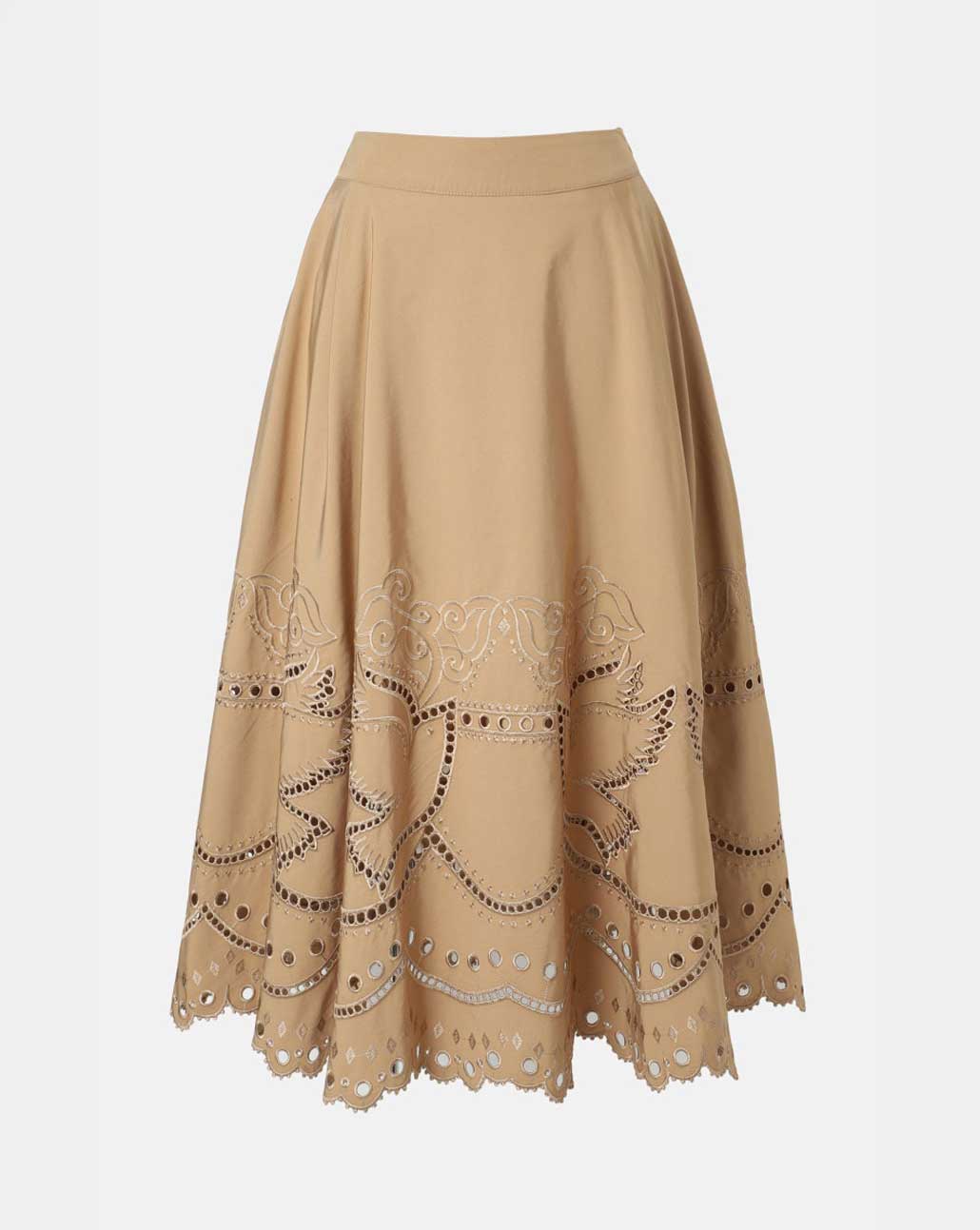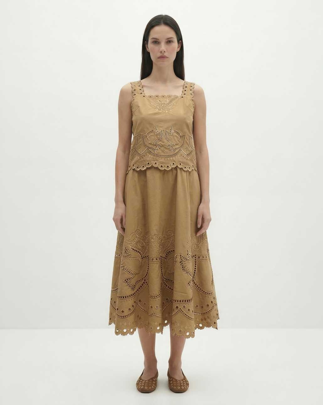 Esta falda midi combina comodidad y elegancia gracias a su cintura elástica y acabado en bordado inglés en el bajo, aportando un toque femenino y refinado. Combínala con un top fluido o blusa ligera para un look veraniego chic y moderno.